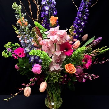 When only the best will do - why not send a true Adelaide's Original? The favorite seasonal and premium flowers of our Adelaide's designers are all in this arrangement! A large footed vase is filled with a dramatic display of the best premium flowers of the season, curly willow and much, much more! Photo is representative of the arrangement for size and style purposes only. We choose our premium flowers fresh daily and only choose the best for this arrangement. Always filled to value. Your satisfaction is also always guaranteed!.