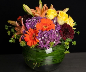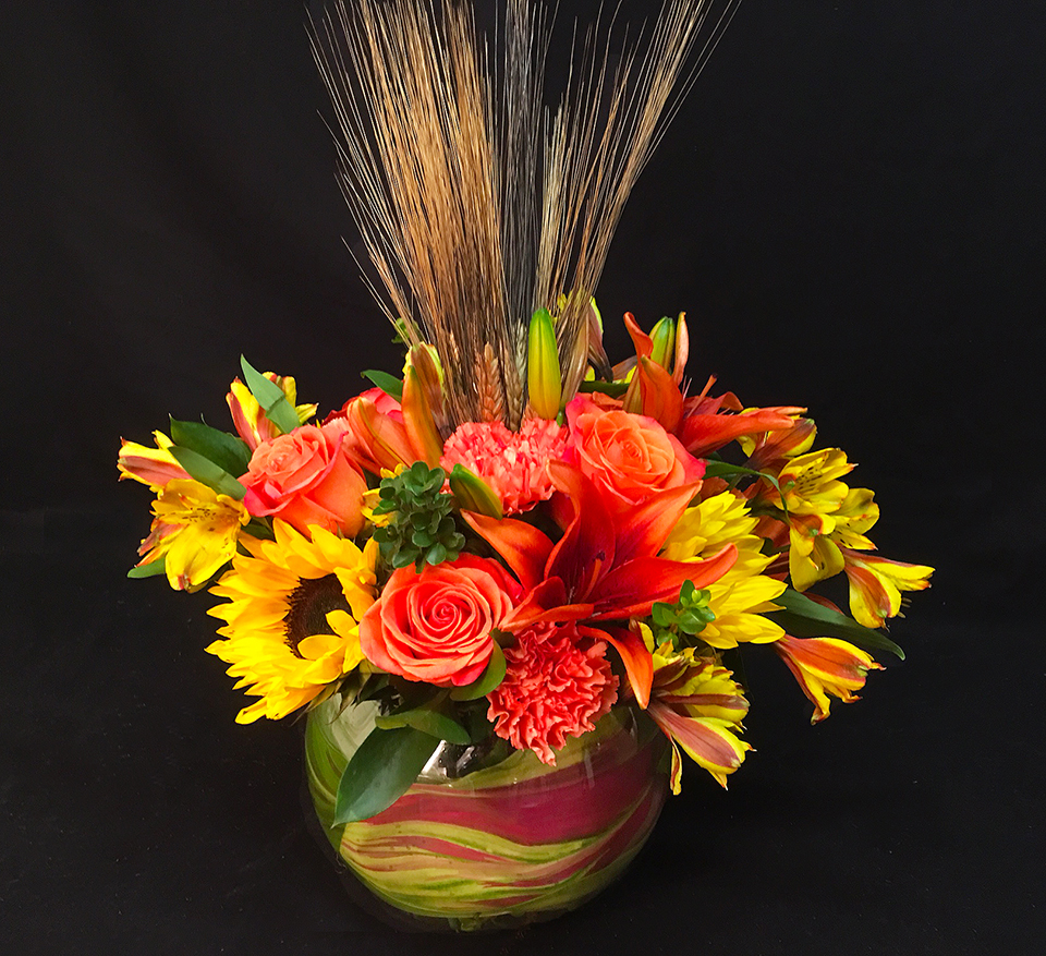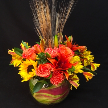 A vibrant display of fall flowers and greens including roses, asiatic lilies, alstromeria and fancy carnations all presented in a ti-leaf lined bubble bowl and topped with a display of dried wheat. Perfect for any occasion!